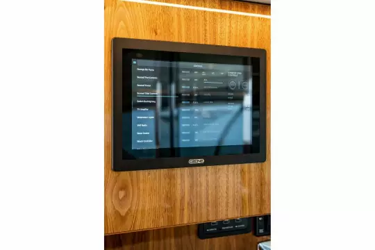 The helm leaves absolutely nothing to be desired. Visibility is phenomenal on all sides thanks to large windows, including the aft bulkhead. Three 17” Garmin screens are integrated with engine room cameras, radar, sonar, and Volvo Glass Cockpit. For even more screen real estate, a dedicated 7” Volvo display sits under the Garmin units and is networked as another Garmin display. A SeaKeeper display, chain counter, spotlight control, bow thruster control, and Czone display round out the rest of the fully complimented helm. Adjustable seats and tilt steering wheel keep the captain comfortable for longer trips.