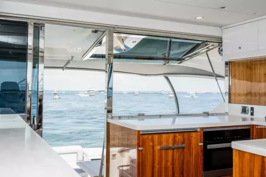Through the sliding salon doors, the galley sits aft on the port side. Riviera always features more refrigeration and appliances than any other boat in class. This is evident with the drawer dishwasher and six drawers for refrigeration and freezing. Plenty of storage, convection oven, and induction burner make the galley as capable as any household kitchen. The salon sits forward of the galley, with two L-shaped lounges face each other with the port lounge having a high-low table that converts to a day bed for lounging or another berth. For nice nights on the hook without the generator, dual overhead sunroofs, sliding windows, and hinging galley window can all open to give natural ventilation underway or at rest. Despite lots of seating and a large galley, the salon area has tons of storage which is a staple for Riviera, something European builders often lack. The entire salon and galley area have durable vinyl flooring, which looks the exact same as wood floors but is more durable and easier to replace planks for damaged areas.