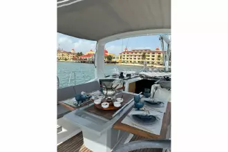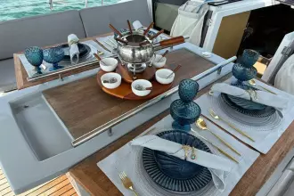 Below deck, large hull windows flood the salon and galley with light. The owner’s cabin forward feels open and private, while the guest cabins aft provide generous berths and locker space. Ventilation, storage and the practical L-galley make extended time aboard comfortable, and the drop-down platform turns every anchorage into a swim-off beach.