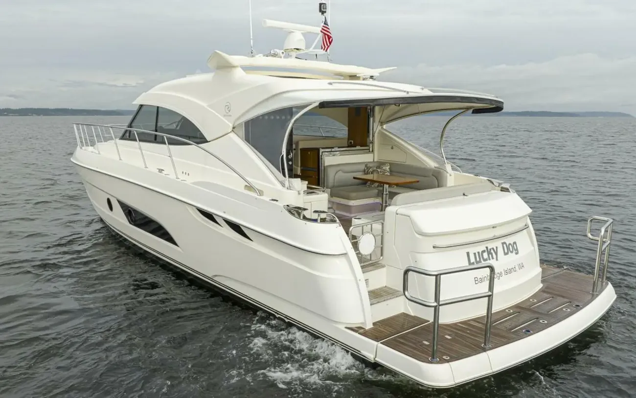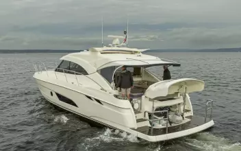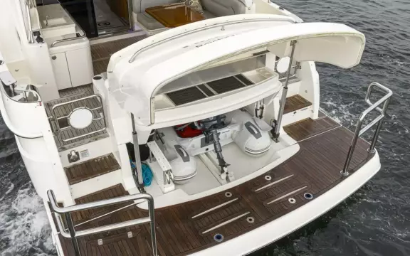 The 4800 Sport Yacht’s distinctive exterior profile features contemporary hull windows and porthole designs that are recessed for added protection, as well as a sports-styled targa arch and an hydraulic boarding platform.