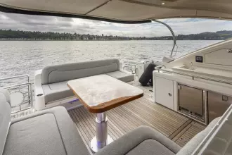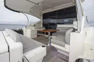 When the celebration begins, a cocktail cabinet to starboard features a lift-up lid, revealing bottle storage and drawers for glasses. Forward, an elevated, leather-upholstered, C-shaped lounge provides excellent visibility forward and through the wide side windows and seats up to six adults around a large, fixed dinette table.