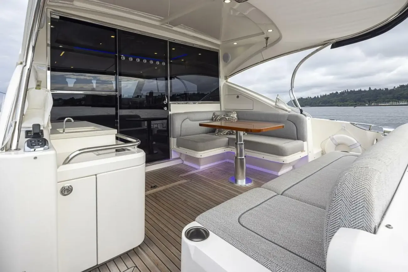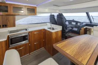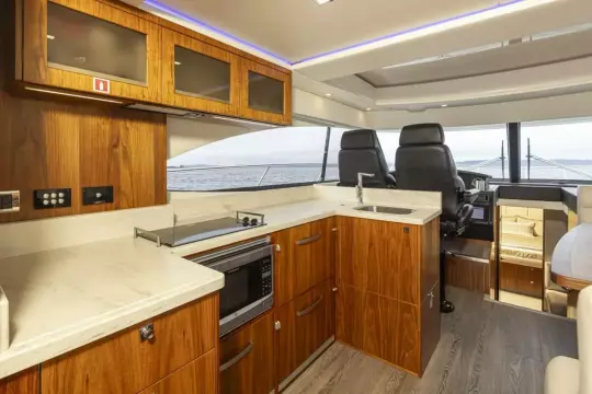 To port there is a solid surface bench-top, wet bar with refrigeration, ice-maker and sink with hot and cold water tap-ware. And on both sides of the 4800 Sport Yacht, there are steps up to the wide walk-around side decks, which feature raised bulwarks and full-length bow rails for safe access to the forward deck.