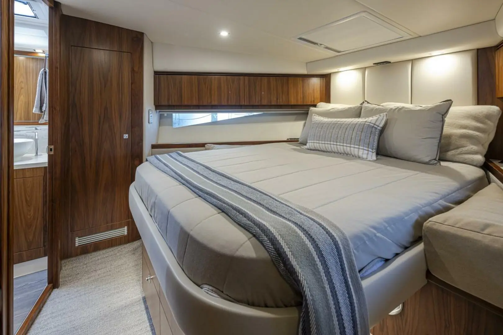 Forward is the luxurious master stateroom featuring a queen-sized walk-around bed with innerspring mattress and volumes of storage underneath, with drawers and gas struts for easy access.
