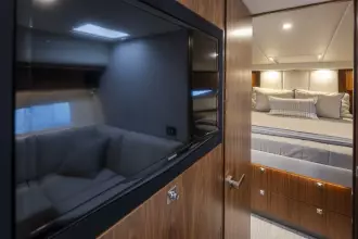 Her rear bulkhead is tempered glass and incorporates a sliding glass door set in a strong marine-grade stainless steel frame. And a large awning window opens out from the spacious saloon to the cockpit, creating a seamlessly flow from boarding platform through to the front windscreen.