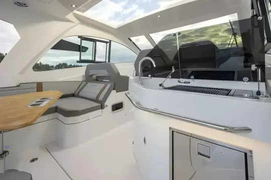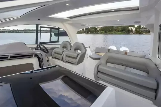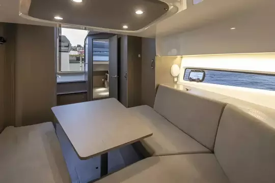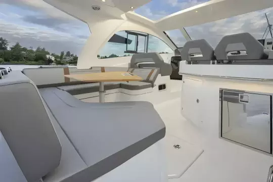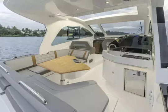 - Seating (Aft) - U-shaped seating can seat 6-7 people, with a table that can be lowered to convert into a sunpad. The back rest can be flipped back to create seating that faces towards the rear view.