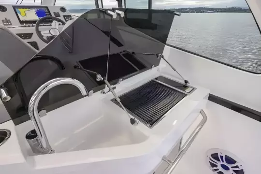 - Storage (Under seating) - L-shaped flip up seating, with gas springs. 1 smaller storage with aft access, which is also place for optional liferaft, but more commonly could store fenders.