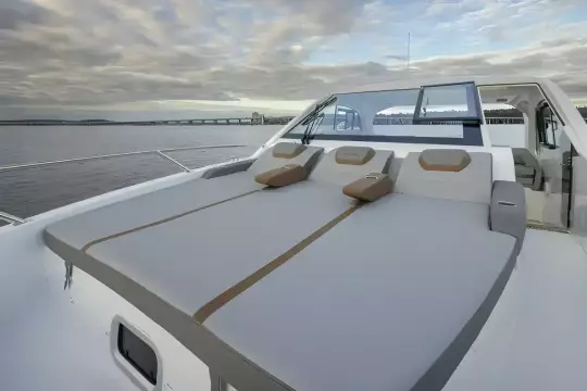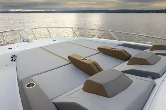- Forward sun deck: 1,95 m x 1,85 m / 6’5’’ x 6’1’’, has a space for three people with armrests and headrests. Sunpad can be stored inside, or there is a vinyl cover. 4 cup holders