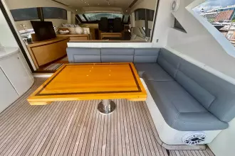 The spacious cockpit is perfect for both relaxation and entertainment, and the yacht includes a large hydraulic swim platform for easy access to the water.