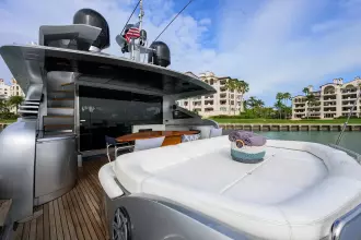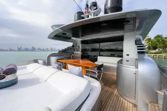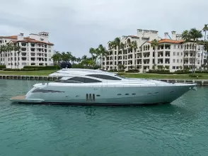 The 2009 Pershing 90 Express "MIURA" features a stunning profile and sleek design, making it an agile and high-performing yacht. It boasts a four stateroom, four head layout that offers ample comfort below deck. The luxurious entertaining area above deck includes a U-shaped sofa, a large pop-up TV, an upgraded sound system, and a lounging/dining area, all enclosed. The yacht is equipped with a flybridge sunning area and bow lounge seating with a fold-away Bimini for sun protection. "Miura" is a must-see for anyone seeking a sleek, fast, and comfortable yacht both at sea and at the dock.