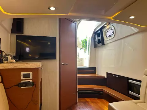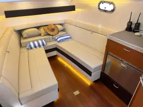 - Large lounge in front of helm w/ fender storage, cup holders and arm rests
