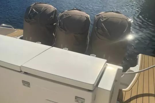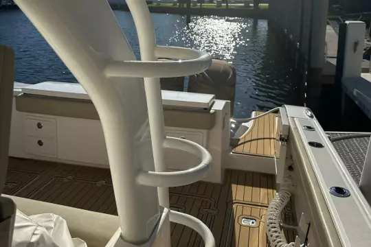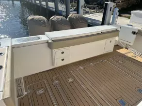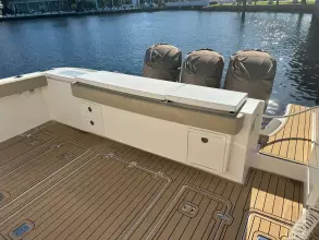 - Transom: BBQ grill, Refrigeration, Sink w/ hot & cold water, Live well, pull out garbage receptacle and Tackle drawers