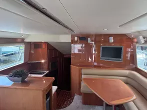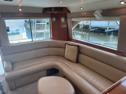 Spacious open layout with carpeting throughout. The galley has Amtico Teak and Holly. An L-shaped leather couch is located to port, with a dinette forward to starboard. The ship's breaker panel is to starboard upon entering the salon. The galley is forward and to port.