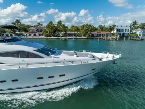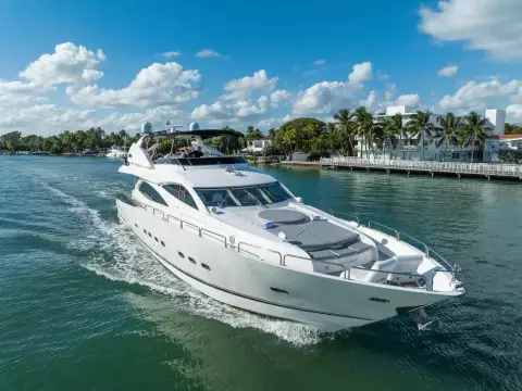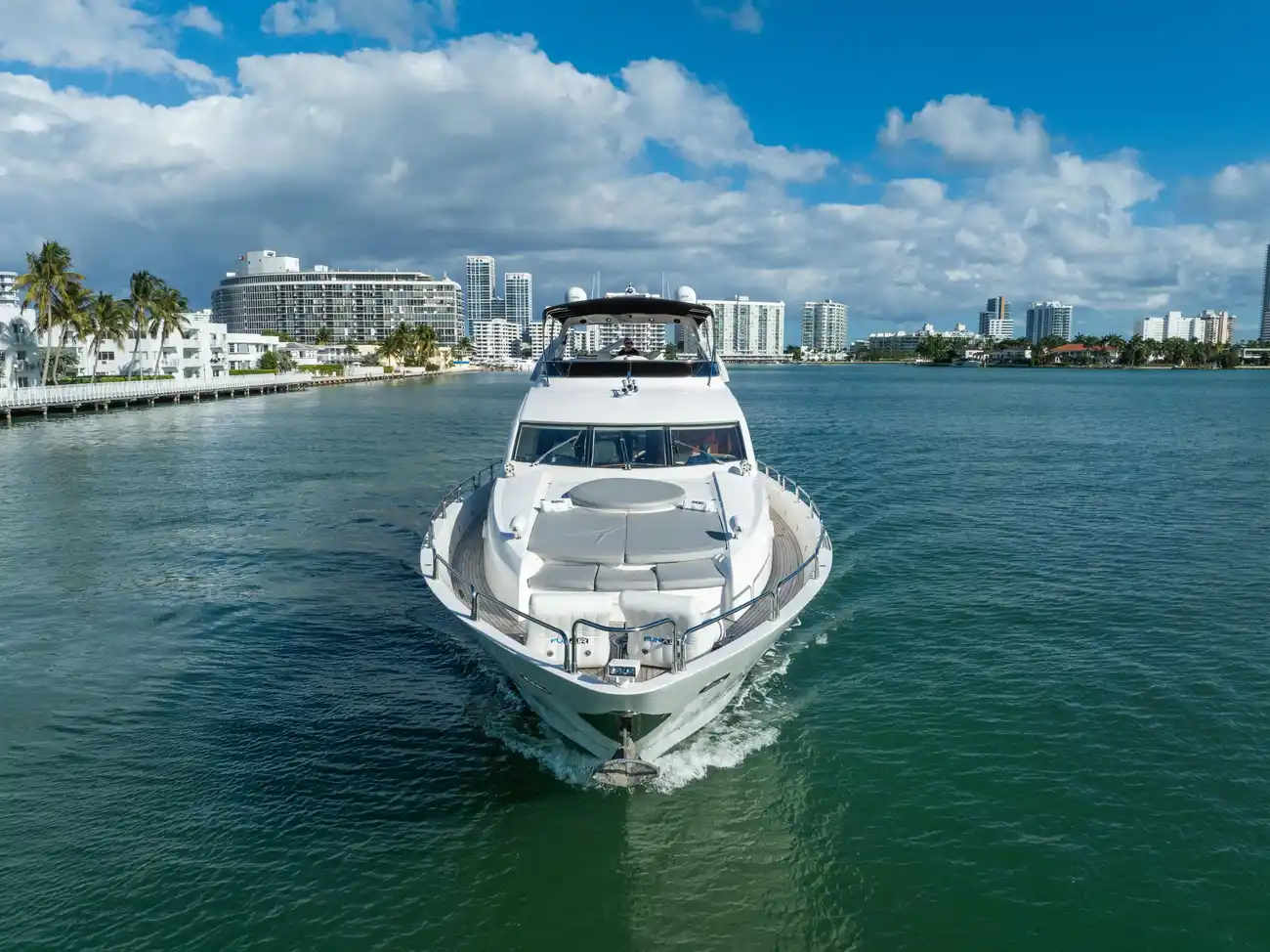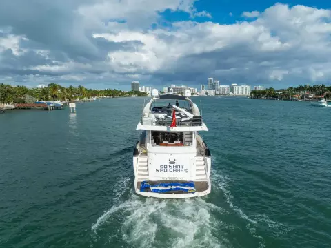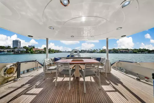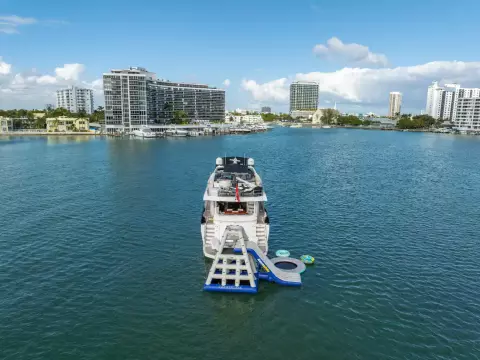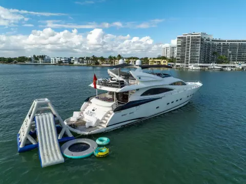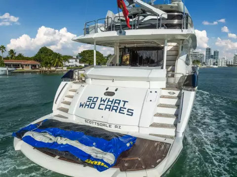 So What Who Cares is a 2003 Sunseeker 94 located in Miami, FL. She features four staterooms, including a full beam master with a private entrance, and five heads with crew accommodations for three. This vessel is designed for entertainment, equipped with a flybridge hot-tub, bar with stools, a summer kitchen, and ample seating and lounging areas.