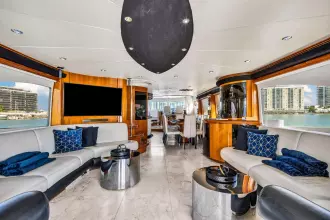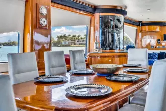 The cockpit includes a sofa and dining table, leading to an expansive main salon. There is a large lounge area on the forward deck. Inside, you will find a formal dining table across from a roomy and fully equipped galley, along with a smaller round dinette adjacent to the helm. Below deck, there are four staterooms with ensuite heads plus a day head.