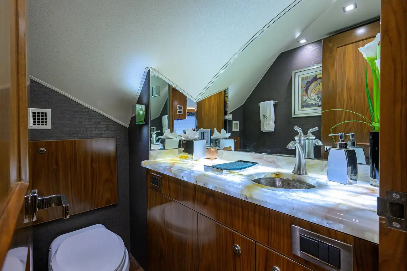 On the main deck, the salon/galley/dinette/wet bar offers motoryacht amenities and access is provided to the spacious aft deck via centerline sliding doors. Access to the enclosed flybridge lounge and yacht command center is via an easy access staircase.