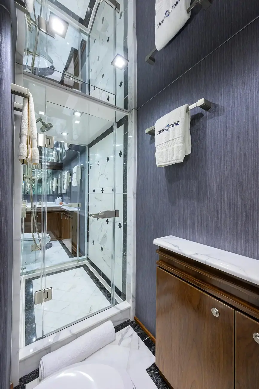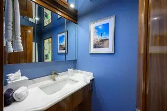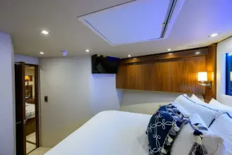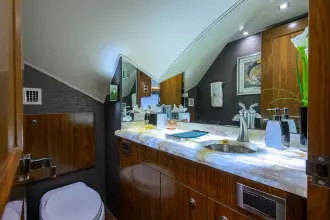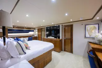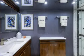 The owner's suite is full beam amidships and features his and hers heads with a shared shower. The forward guest suite sleeps two on a centerline queen berth with ensuite facilities. Aft to port is guest suite #2 with twin lower berths and ensuite head. To starboard, private accommodations include a queen berth and private head/shower. Aft to port is the fourth guest suite with a berth for two and private head/shower.