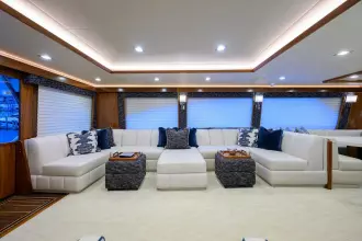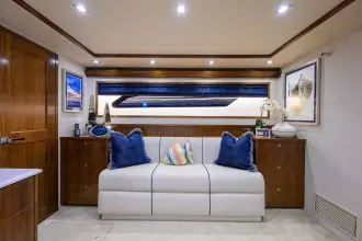 Custom Channell glass backsplash, custom backlit countertops in galley/wet bar/salon, custom ottomans with removable trays for storage, carpet runner on flybridge, double carpet padding in salon and flybridge, carpet runners for salon, companionway and steps, motorized blinds in salon and master stateroom.