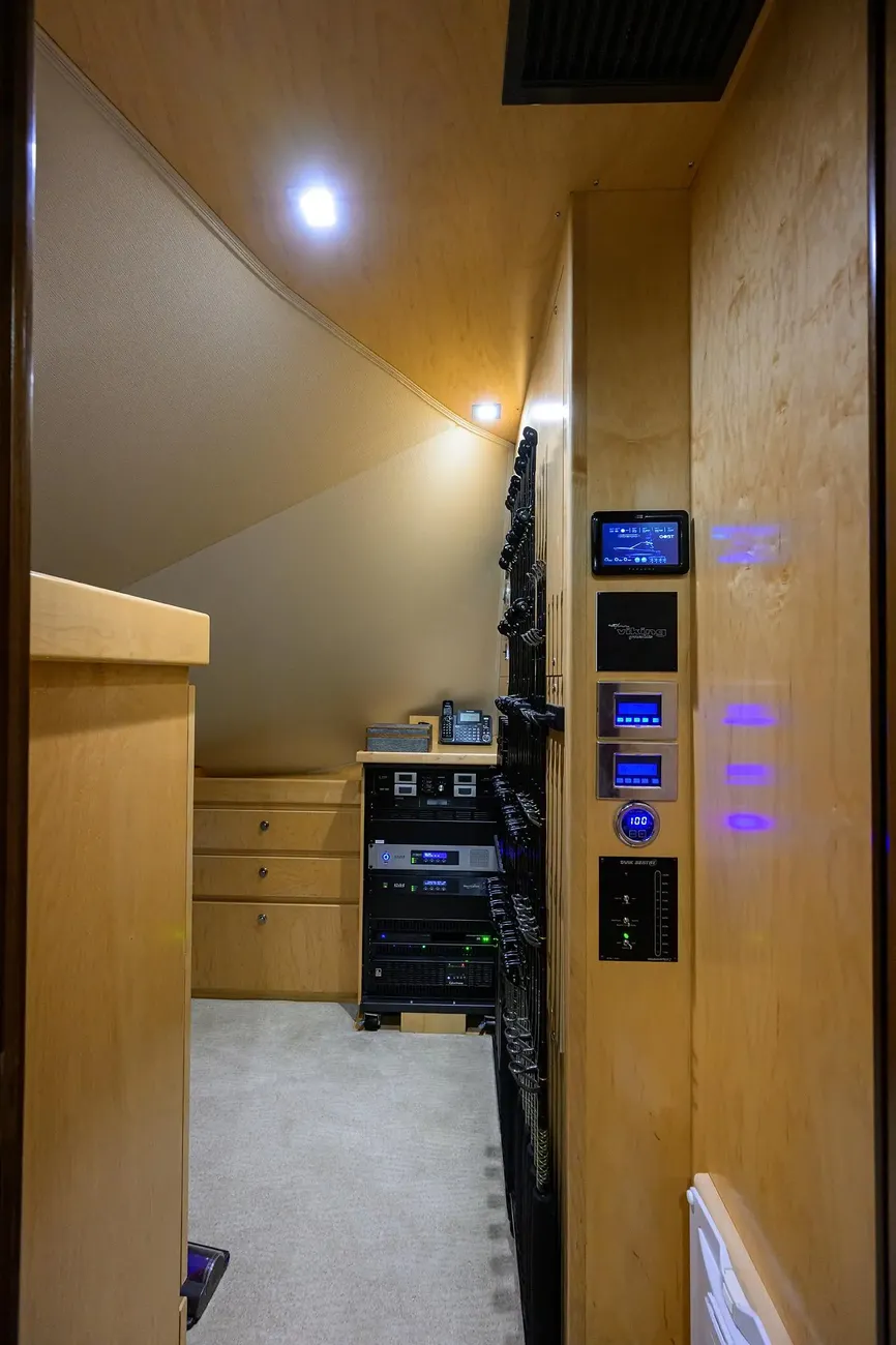 SEAKEEPER SK35 gyro stabilizer with 1825 sea hours, Upgraded WILLY VAC system, electric door for enclosed flybridge door, CATHELCO anodes for both central seawater strainers, 1000# per day ice chipper, 550# per day ice chipper, fuel polishing system, double pass system for watermaker, commercial pre-filters for watermaker, MUIR Atlantic 4000 hydraulic windlass, additional fresh water pump, back up seawater pump plumbed in parallel, dual power steering pumps.