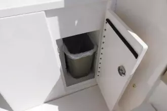 - Vacuum flush marine head with 10-gallon holding tank, macerator discharge pump, deck pump-out fitting, and bronze through hull fitting