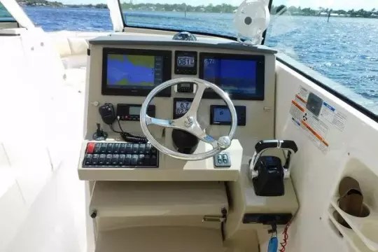 - Molded fiberglass aft tilting helm with instrumentation, visor, electronics mounting surface, fold-out fiberglass foot rest/platform, and safety lanyard