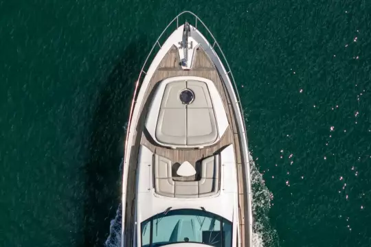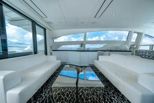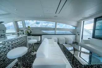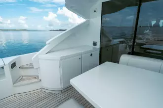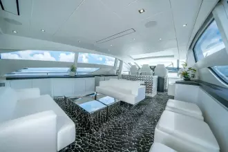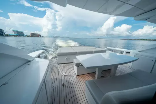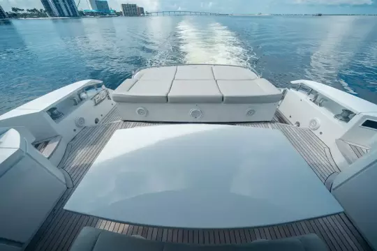 The foredeck area offers a perfect retreat for private relaxation. It includes a spacious U-shaped lounge with a manual canopy and a forward sun pad. The versatile aft deck features a large sun pad near the transom, along with a dining area situated just aft of the main entrance. The main dining table can be converted into an additional sun pad, while the overhead hardtop is retractable to allow for more light.
