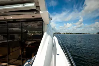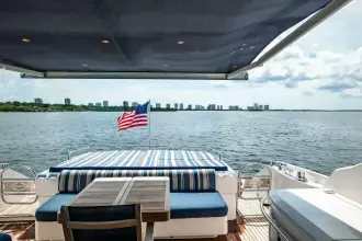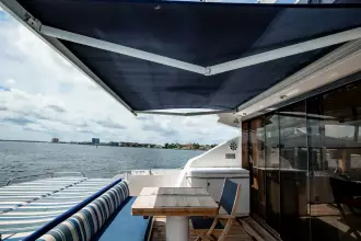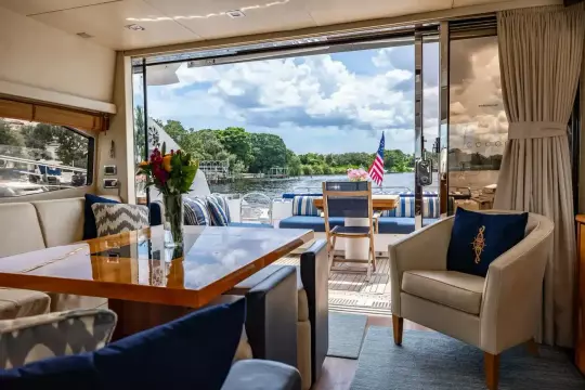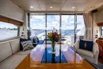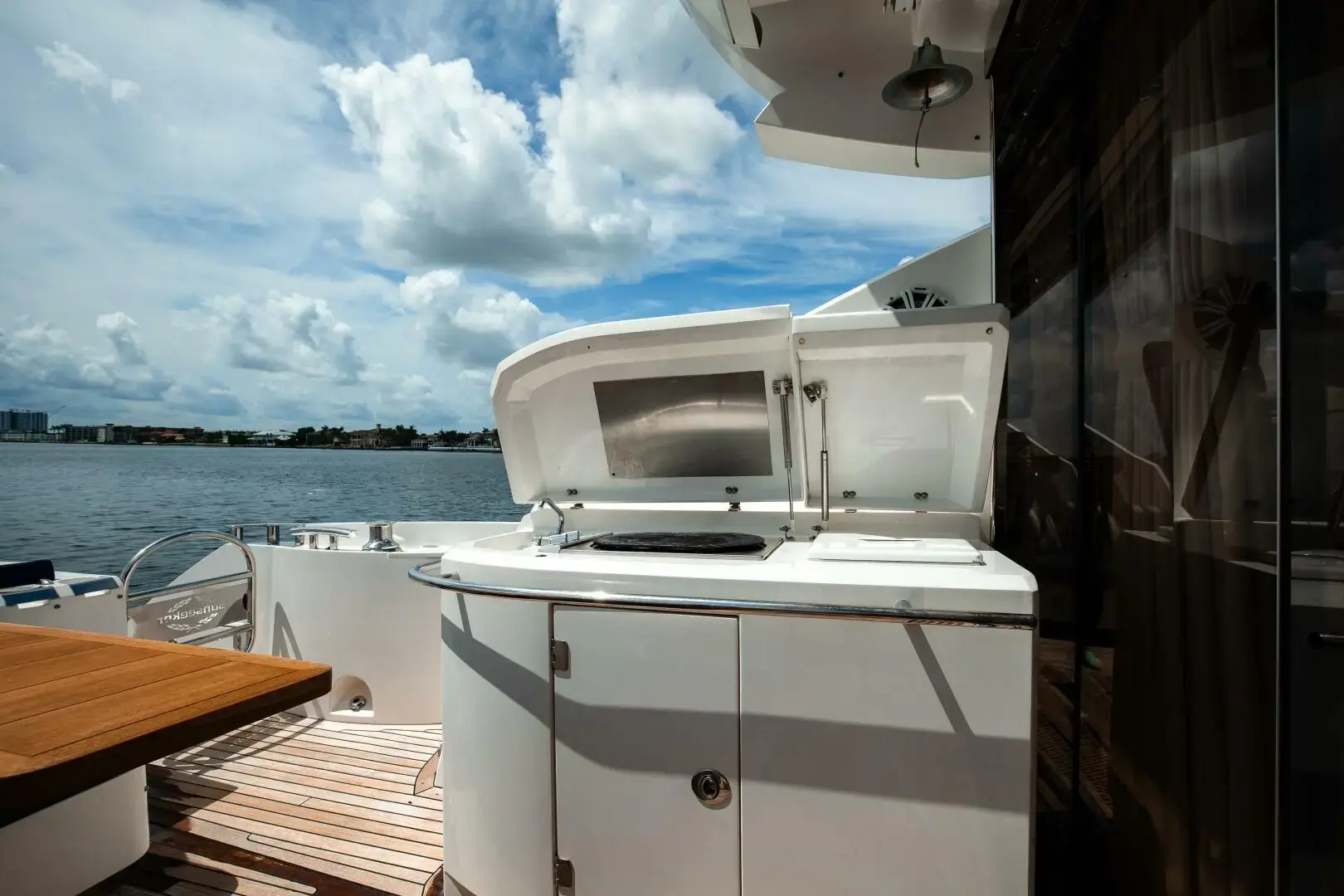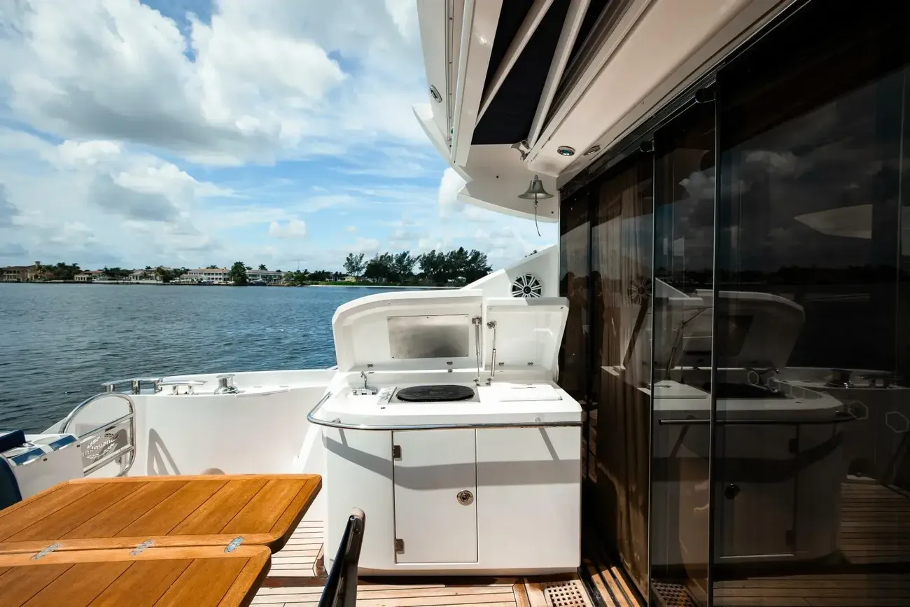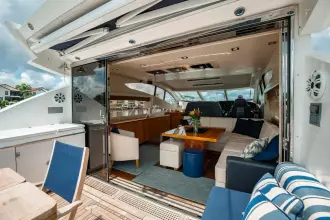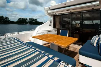 One of the standout features is the spacious aft deck, seamlessly connected to the interior by large sliding glass doors, creating a flow-through space perfect for entertaining. The panoramic windows and sunroof flood the salon with natural light, ensuring that even when you're inside, you feel fully immersed in the surrounding ocean views. The exterior is just as impressive, with two massive sunpads, complemented by a foldable teak table that can expand for dining or contract for more functional space. The upgraded summer kitchen, equipped with a grill, sink, and fridge, makes it easy to enjoy meals outdoors.