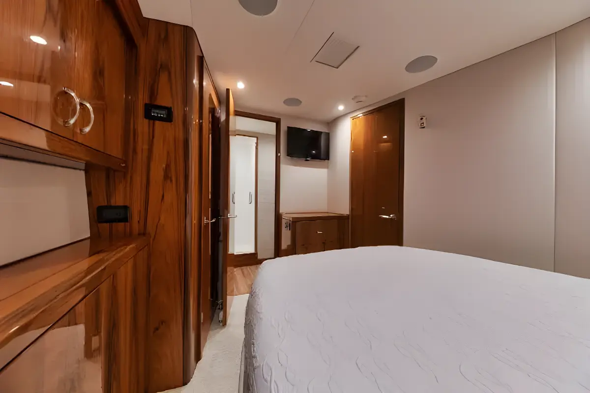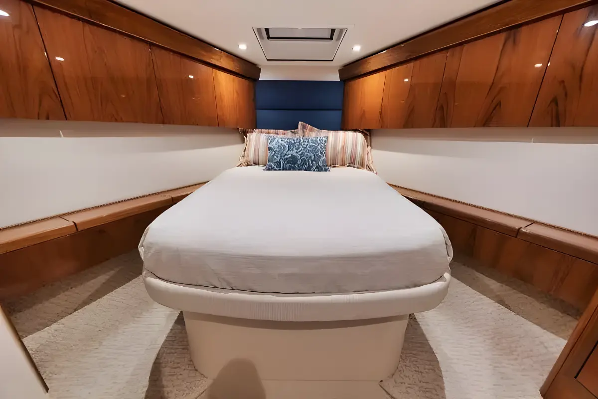 - Queen berth with custom Tempur-Pedic mattress, upholstered headboard and cedar lined storage underneath