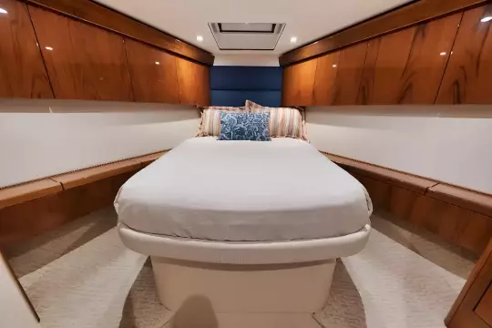 - Queen berth with upholstered headboard and cedar lined storage underneath