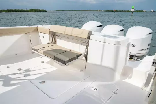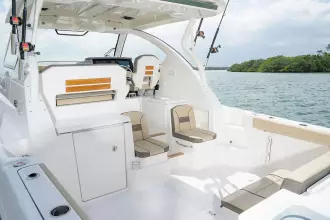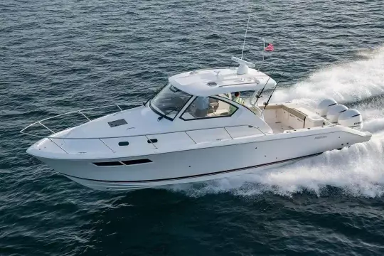 Introducing the stunning 2025 Pursuit OS 355 Offshore, a remarkable sports fishing boat that embodies innovation and performance. With an impressive overall length of nearly 38 feet, this vessel is designed for both adventure and comfort on the water. Crafted from durable fiberglass, its deep Vee hull shape ensures a smooth and stable ride, perfect for navigating various conditions. Powered by three robust Yamaha F350 outboard engines, each delivering 350 horsepower, this boat promises exhilarating speed and agility. The stainless steel propellers enhance performance while ensuring reliability during your fishing excursions. The OS 355 Offshore also features a well-appointed head, providing convenience for longer trips. With its sleek design and advanced engineering, this new model is perfect for avid anglers and leisure seekers alike, making every outing a memorable experience on the water.