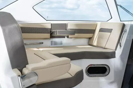 • Electrically Actuated Custom V-Berth Seating with Fixed Cushions that Converts into Queen size Berth