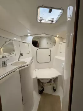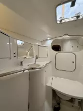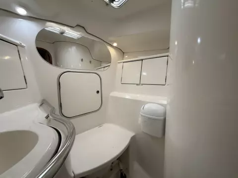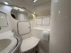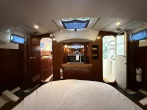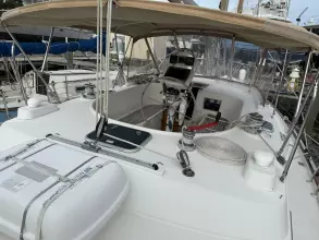 The center cockpit provides a safe, protected space for sailing and relaxing, with easy access to the transom swim platform and shower. Below deck, the layout features two private cabins, each with its own head, along with a functional galley and a spacious saloon for dining or unwinding.