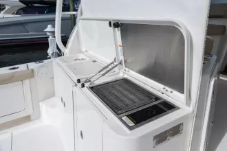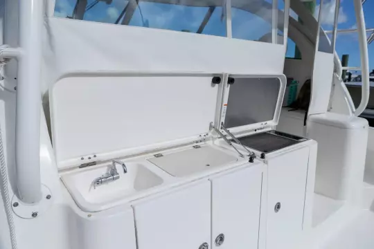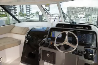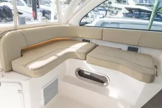 The OS385 offers efficiency & performance with the reliability and durability of Yamaha Outboards. Relax in the climate-controlled helm with a separate helm air conditioner, complete suite of Garmin electronics, full windshield, and comfortable lounge to port. The 13’ beam delivers a spacious cabin offering full galley, ample fridge/freezer space, 2 full berths, dry head, and plenty of cockpit for fishing or cruising.