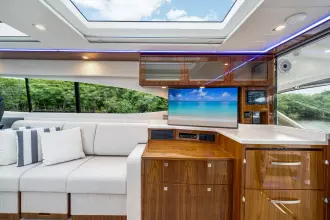 Introducing the Platinum Edition Riviera 6000 Sport Yacht! Featuring a long list of cosmetic and equipment upgrades, this is a fresh new take on a proven world-beater. We have this new, custom-built 6000 Sport Yacht. We spec'd her with the preferred lower lounge/three cabin/three head layout, high gloss walnut interior joinerwork, and a very long list of factory and custom options we would love to discuss with you.