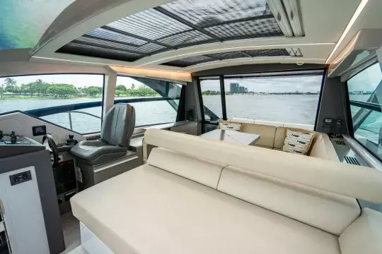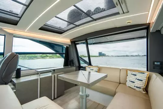 The glazed surface above the cockpit can be electrically lifted, while the two sections of the glass door can be opened or closed separately: the upper one can be manually tilted toward the outdoor ceiling panel; the lower one opens into the interiors, creating a partition between the salon and the cockpit and ensuring maximum safety when children are on board.