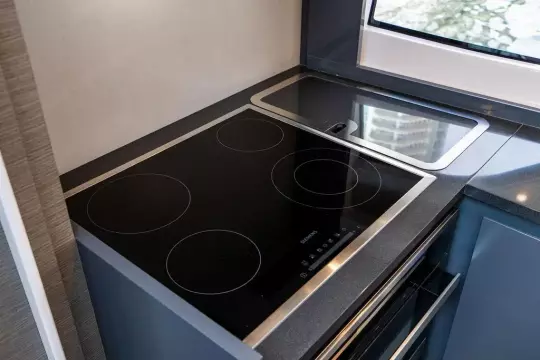 The kitchen’s Cantalupi LED fixtures illuminate its beautiful Corian Anthrachite surface. The same material is used on the table top of the dinette, which is built around a foldable table that is available upon request.