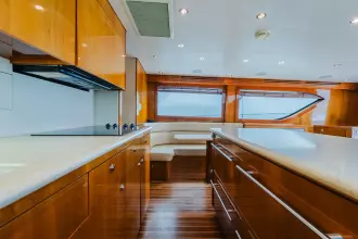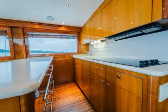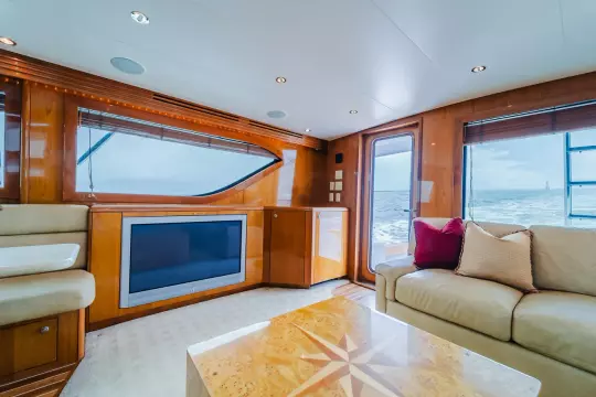 When you step into the salon through the full glass door, you are welcomed by a spacious environment. On the port side, there is an L-shaped sofa, while the starboard side features custom cabinetry that includes built-in liquor storage and an icemaker. With a large galley and thoughtful design.
