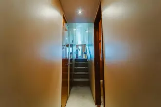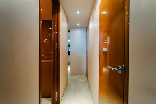 The wide Companionway provides access to staterooms via pocket door to Master Stateroom, third Stateroom, & Head to starboard; washer/dryer midship; and private doorway for forward VIP Stateroom.