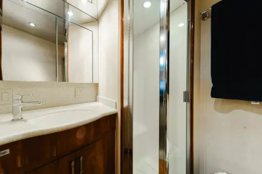Entering the Master Stateroom, you will find a spacious suite that features a private full head located forward. The stateroom includes a large athwartship berth, cherry nightstands, and spacious double cedar-lined closets.