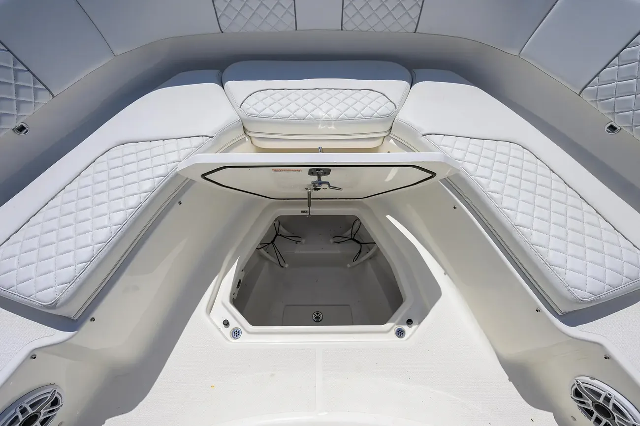 - Helm seating with premium white upholstery, diamond stitching, and fold-down armrests