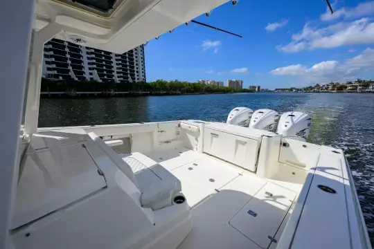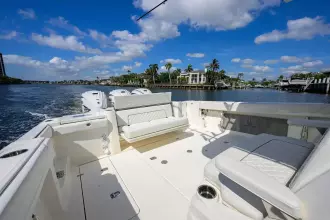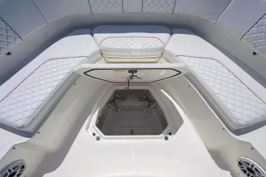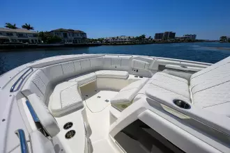 - Spacious cockpit with foldaway seating and an entertainment center perfect for socializing and cruising.