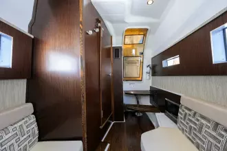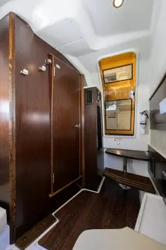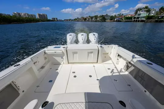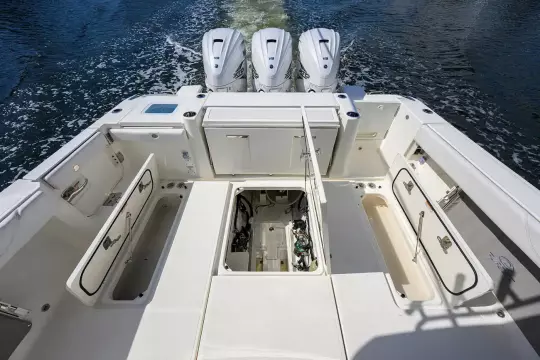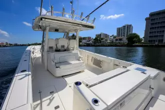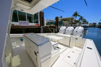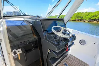 - Integrated diesel generator, refrigerated storage, and electric retractable sunshade offer big-boat comfort in a manageable size.