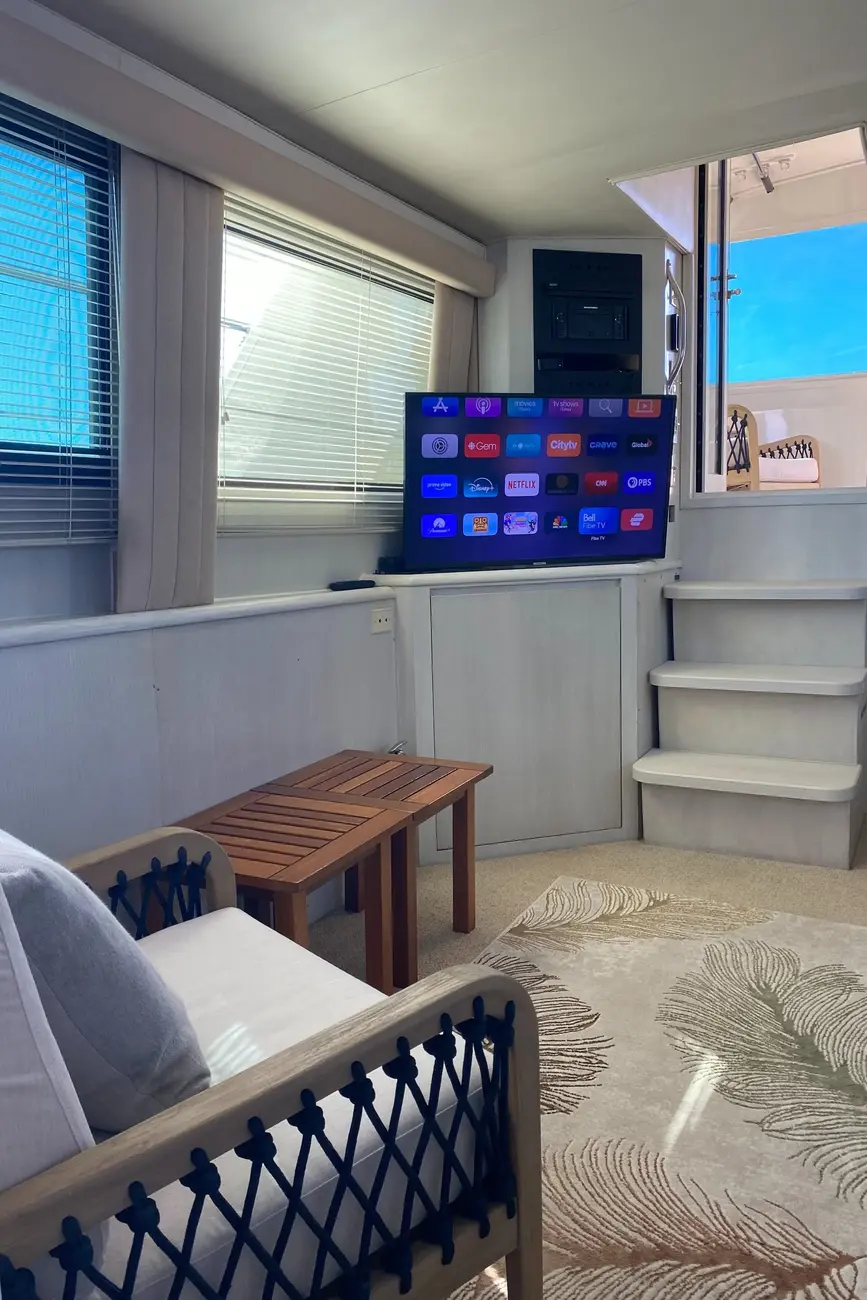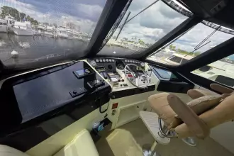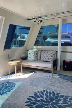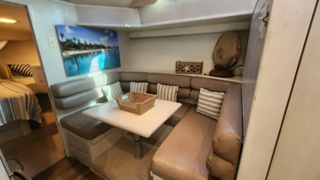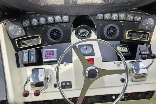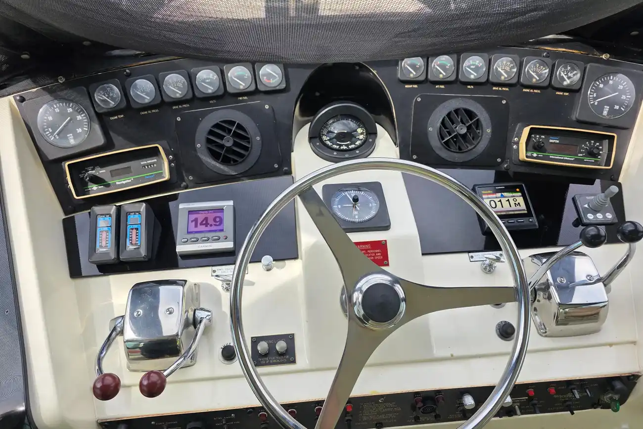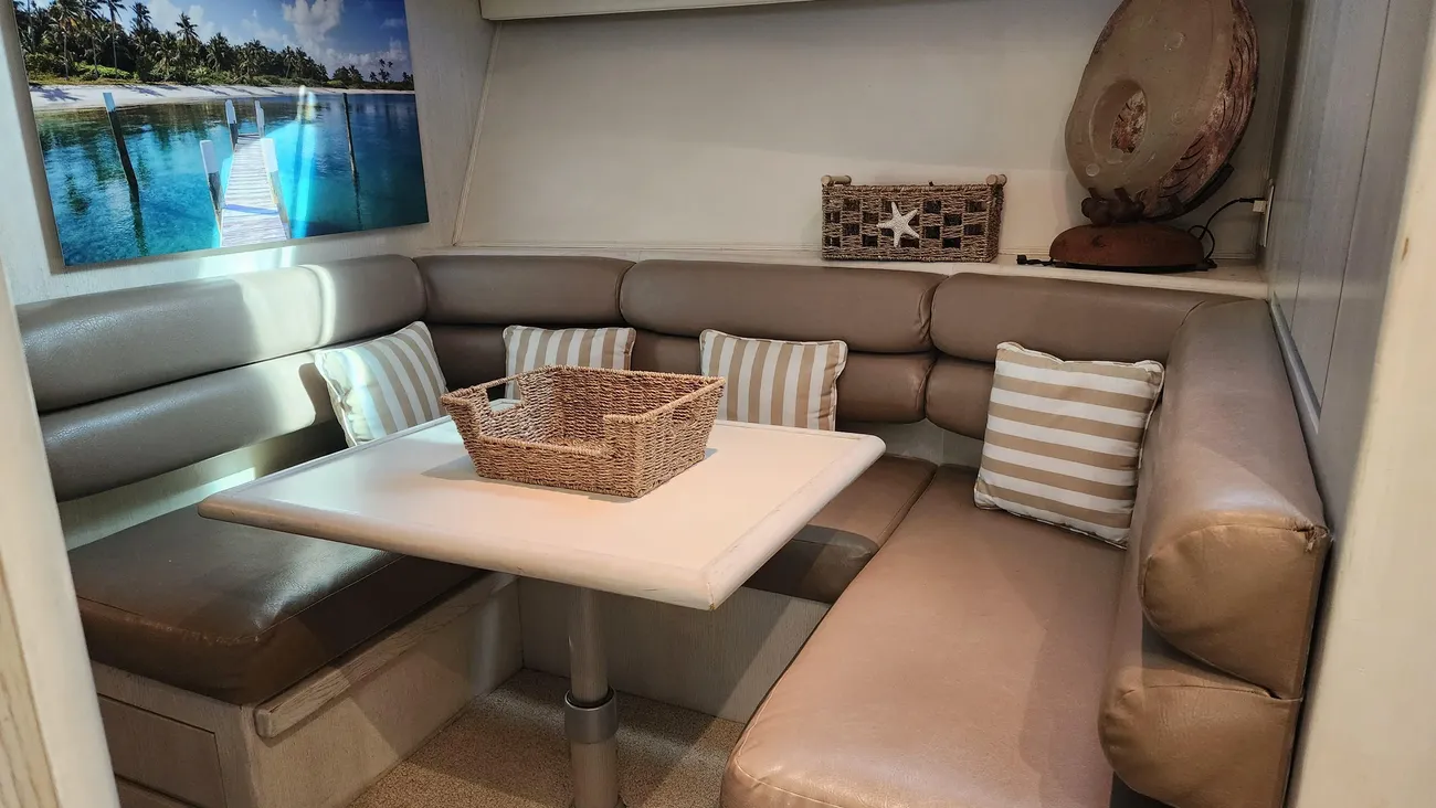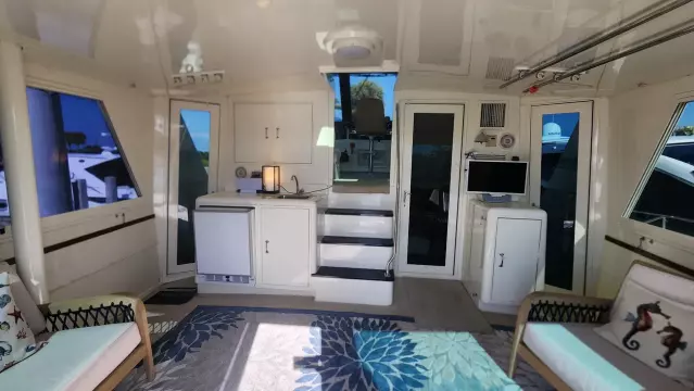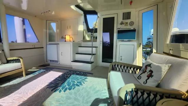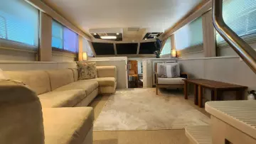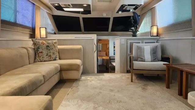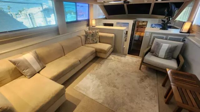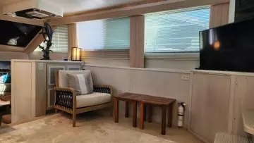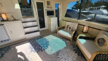 This boat has been treated with TLC its whole life. The interior is in excellent condition and has never been abused. The ash wood walls are all in excellent condition. There are no rips or tears in the wallpaper in the heads or staterooms. There is new teak and Holley laminate flooring in all three heads. All soft goods, bedding, dishes, and cutlery are new and of the highest quality. The rugs on the aft deck and main salon are also new.