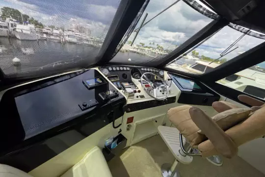 It was built as a “Lauderdale Lady”, incorporating all available options. Very few Lauderdale Lady boats were built each year, making them showpiece boats for Hatteras to promote its lineup of new boats. The hard enclosure of the fly bridge and aft deck is a rare combination, with both spaces being air conditioned. This configuration is ideal for both cooler and hot environments.