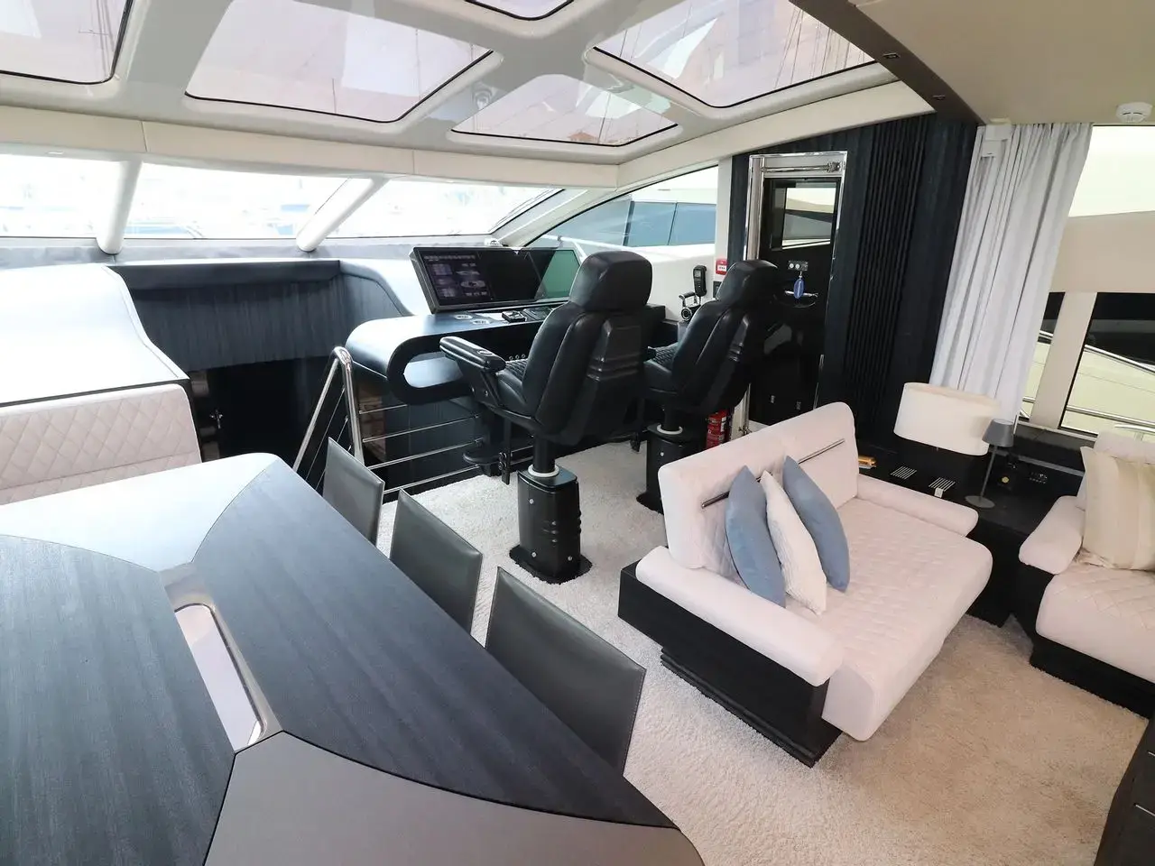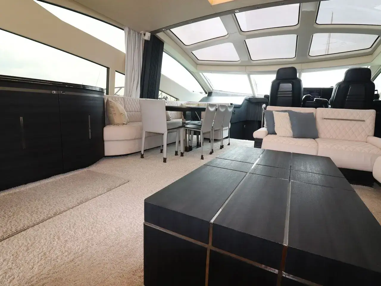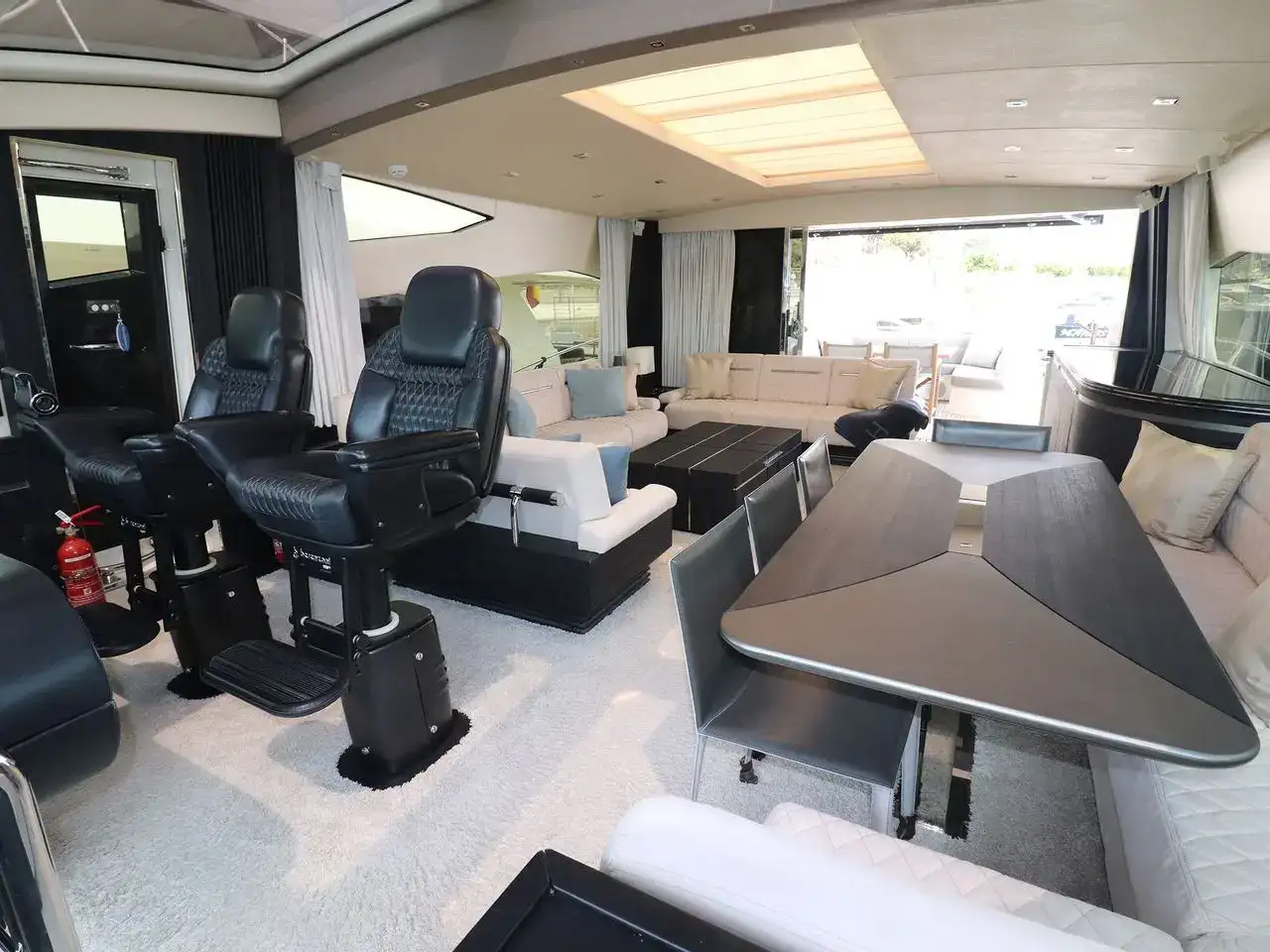 Step aboard the Predator 80 and experience her spaces as if you were walking through them yourself.From the aft cockpit, a wide lounge area welcomes you, the ideal spot for relaxed lunches or evening gatherings, shaded and close to the sea. Large glass doors open into the main saloon, where expansive side windows flood the room with natural light. The open-plan design combines a comfortable sofa lounge with a dining area and, forward, the helm station, and all surrounded by panoramic sea views.