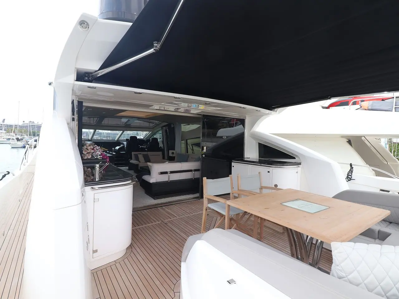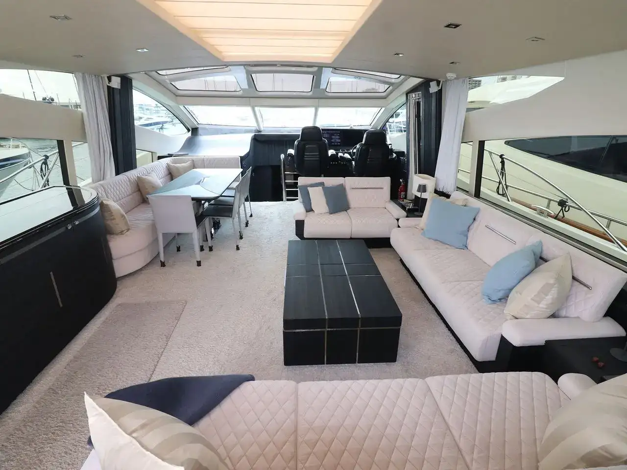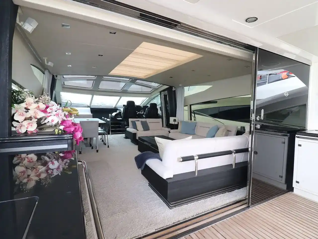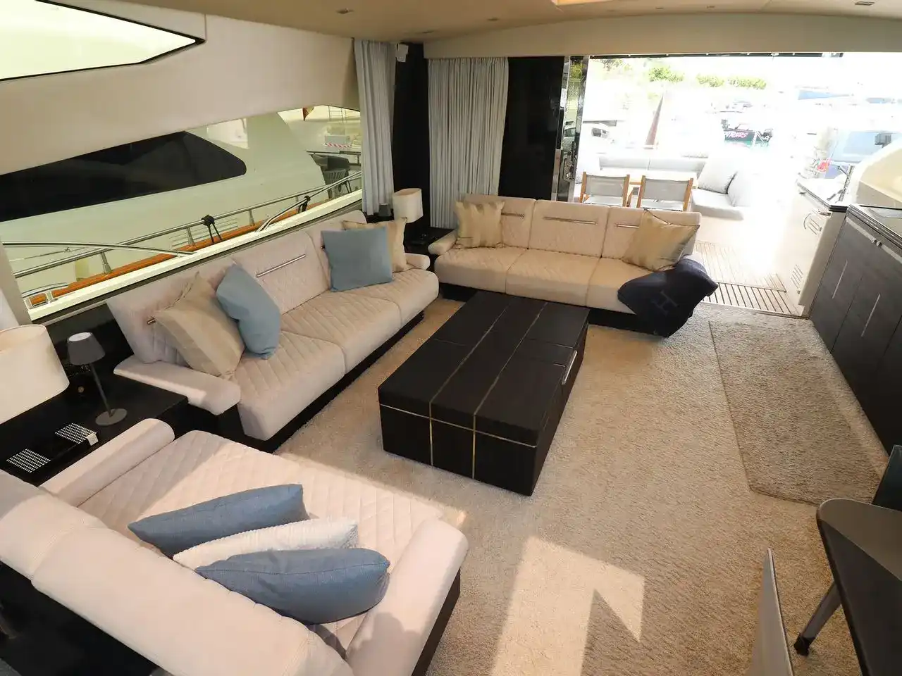 Step aboard the Predator 80 and experience her spaces as if you were walking through them yourself.From the aft cockpit, a wide lounge area welcomes you, the ideal spot for relaxed lunches or evening gatherings, shaded and close to the sea. Large glass doors open into the main saloon, where expansive side windows flood the room with natural light. The open-plan design combines a comfortable sofa lounge with a dining area and, forward, the helm station, and all surrounded by panoramic sea views.