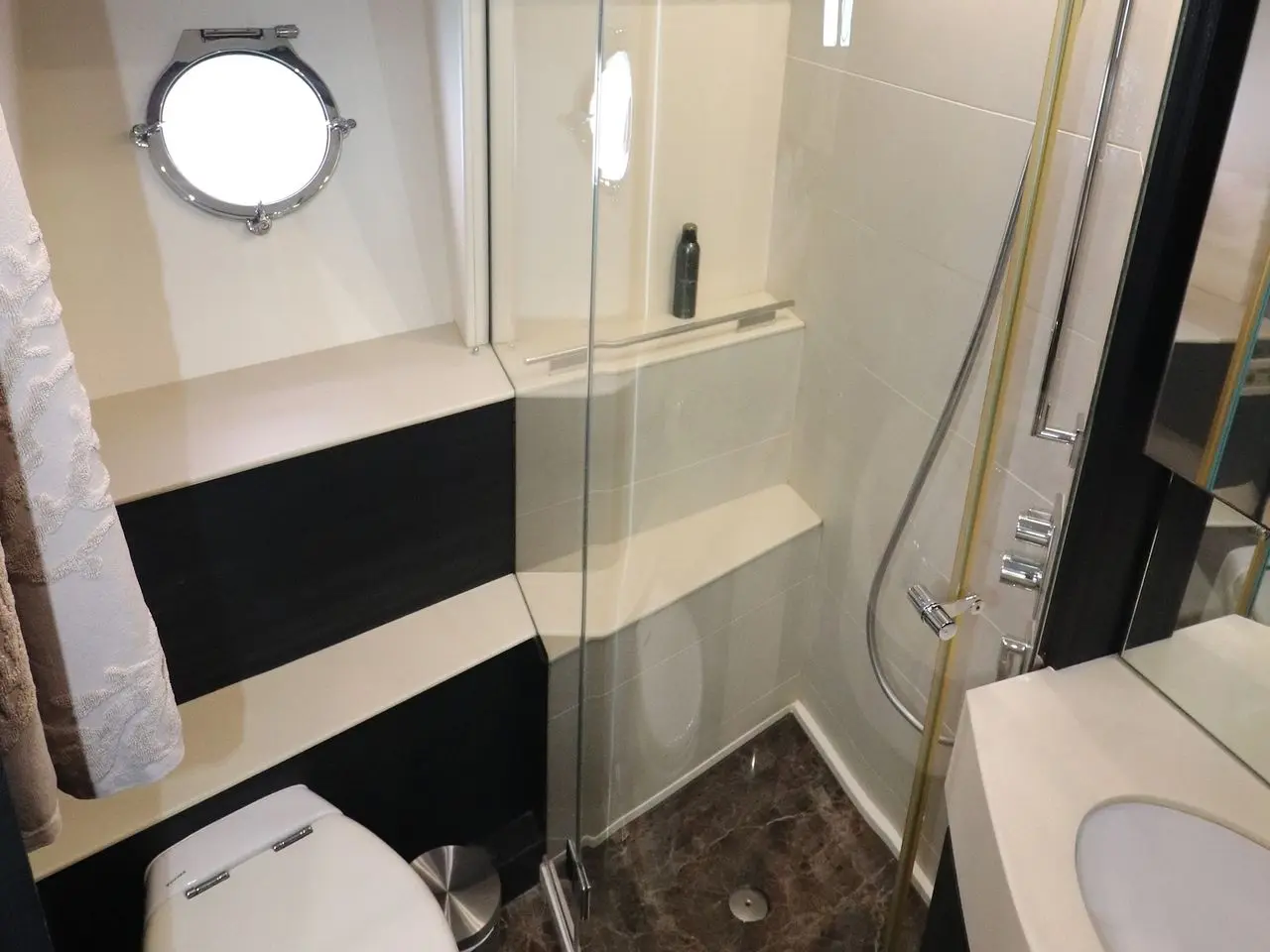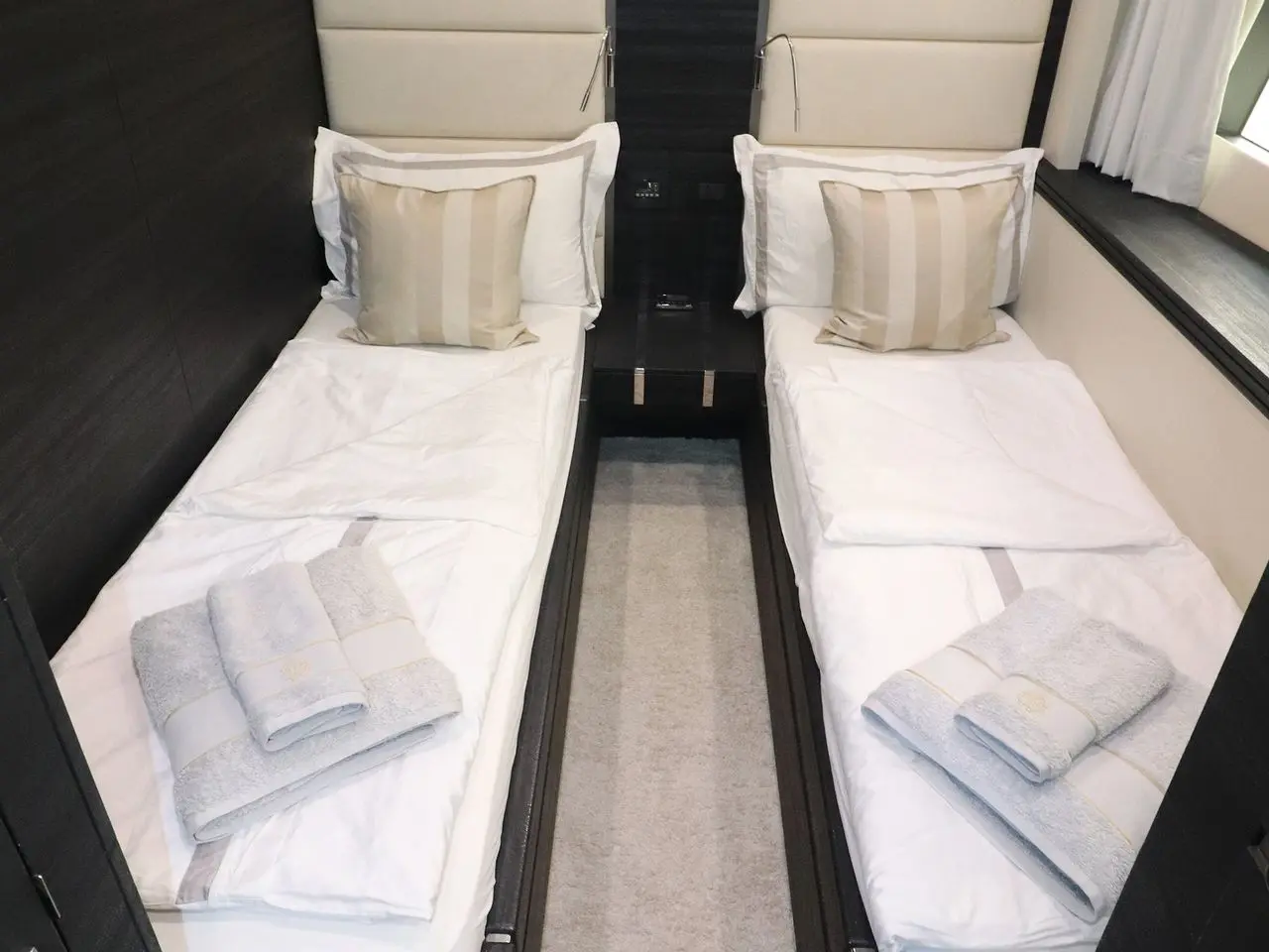 The full-beam master suite amidships features a king-size bed, large windows, a walk-in wardrobe and a private en-suite bathroom with a separate shower — your private retreat at sea. Forward lies the VIP cabin with a double bed and its own en-suite, while two additional twin cabins, one with convertible berths, share a beautifully appointed bathroom.
