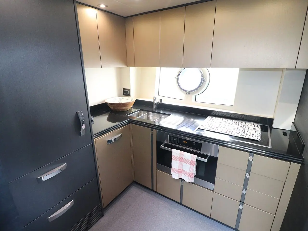 Descending to the lower deck, you’ll find the fully equipped galley, designed with functionality and elegance in mind. Here, the layout flows naturally into the guest accommodation area.