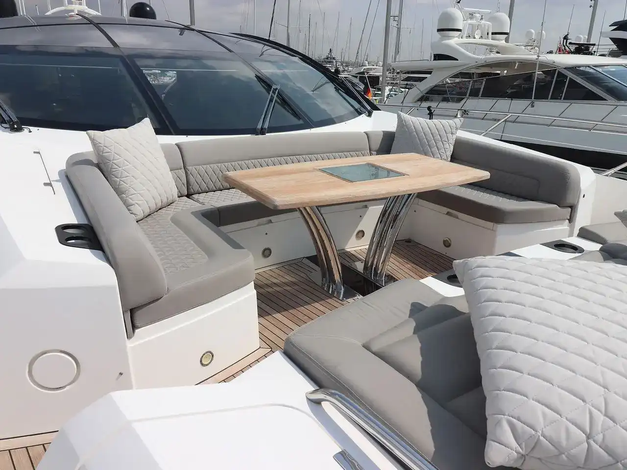 Step aboard and you'll notice the craftsmanship: expansive hullside windows, a retractable carbon fiber hardtop that invites light in, and interior finishes that spare no expense. High-quality upholstery, deep-pile carpeting, fine woods and metal details feature throughout. Outdoor living is spectacular, cockpit and foredeck lounging, a fully equipped wet bar, a hydraulic swim platform, and a gangway that makes boarding effortless.