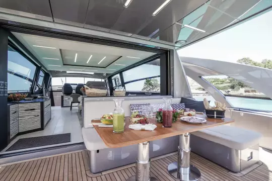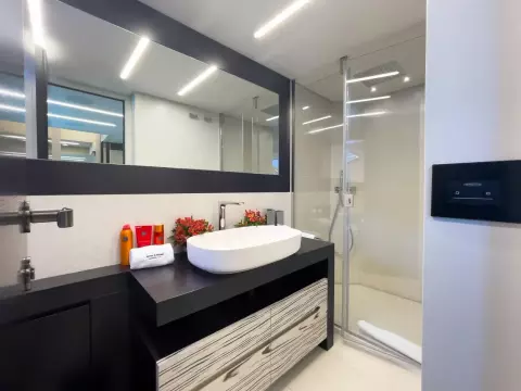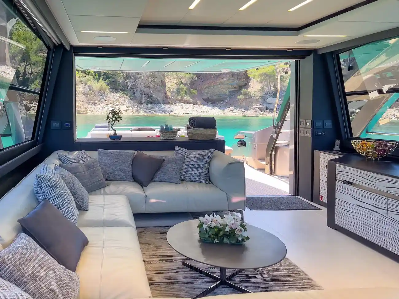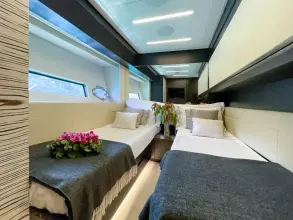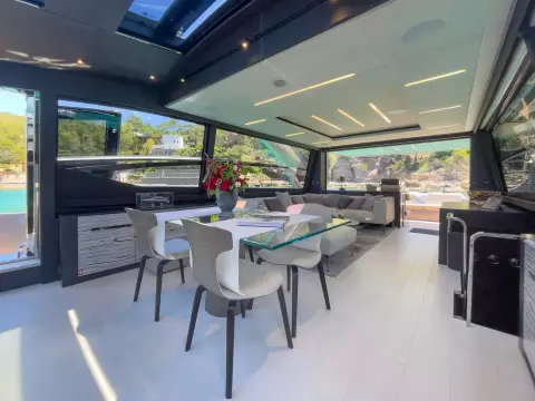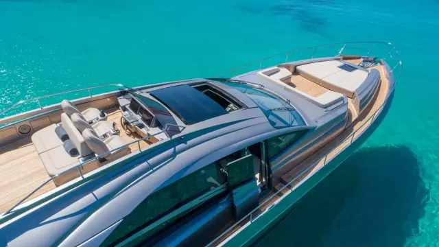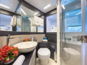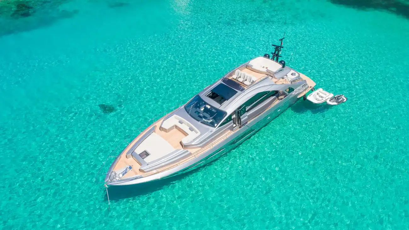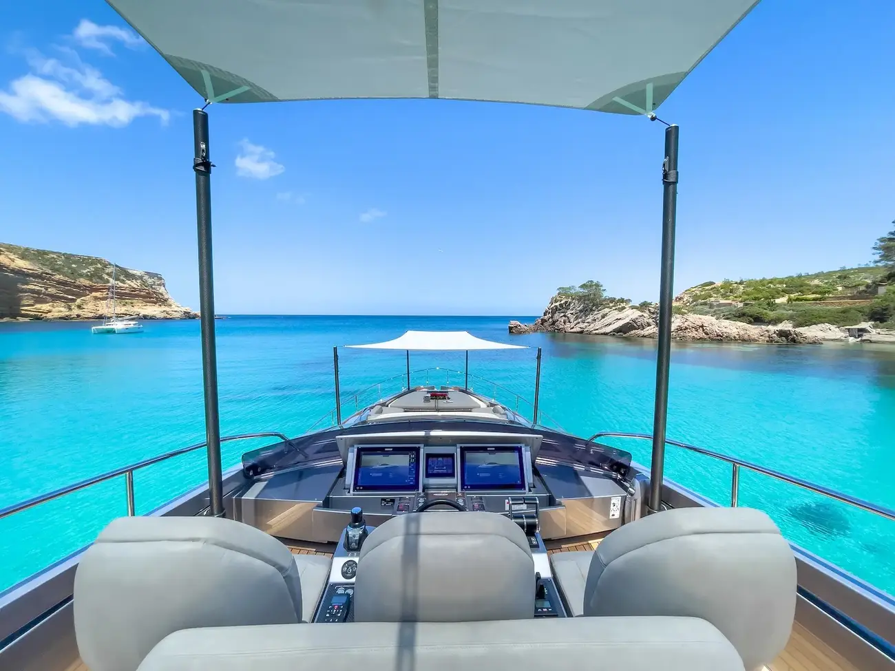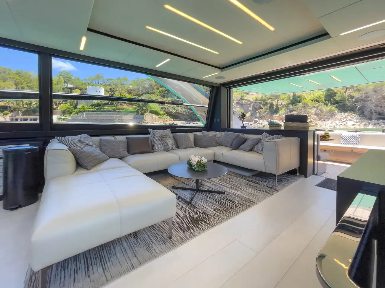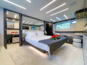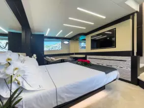 The Pershing 8X perfectly blends Italian design and cutting-edge performance. This 26-meter masterpiece blends sleek, sporty lines with luxurious comfort, built entirely from lightweight carbon fiber for enhanced speed and agility. Reaching top speeds of 48 knots, she offers exhilarating cruising paired with refined interiors and generous outdoor spaces. Her contemporary layout includes four elegantly appointed cabins, accommodating up to eight guests. Ideal for thrill-seekers and style lovers alike, she redefines the yachting experience—delivering innovation, power, and prestige in every nautical mile.Optional Extras AIR/CO Supertropic 144.000 BTU (diff from std) Bimini with poles on sundeck Cockpit table with electrical movement Decorative cushions Driving station on sundeck Electric blinders in VIP cabin and guest cabins Electric curtains in VIP cabin and guest cabins Pullman bed in guest cabin Stern thruster hydraulic 31HP Underwaters lights installed lenghtwise on the two sides of the hull Underwaters lights under the bathing platform Upgrade to 2x24 kw Mase generators (Diff. da std 2 x 19 kw Onan) Watermaker Idromar 180 Lt/H (diff from std) Waterproof cover for outside Bedspreads (diff from std) AIR/CO Supertropic 144.000 BTU (diff from std) Bimini with poles on sundeck Cockpit table with electrical movement Decorative cushions Driving station on sundeck Electric blinders in VIP cabin and guest cabins Electric curtains in VIP cabin and guest cabins Pullman bed in guest cabin Stern thruster hydraulic 31HP Underwaters lights installed lenghtwise on the two sides of the hull Underwaters lights under the bathing platform Upgrade to 2x24 kw Mase generators (Diff. da std 2 x 19 kw Onan) Watermaker Idromar 180 Lt/H (diff from std) Waterproof cover for outside Bedspreads (diff from std) Dynamic positioning system Easy dock for surface drives Electric curtains fabric (diff from std) External upholstery (diff from std) Full Simrad navigation system monitor 24" (diff from std) Galley floor (diff from std) Mosaic in guest bathrooms (diff from std) Mosaic in master bathroom (diff from std) Mosaico in VIP bathroom (diff from std) Music hull Naviop - Double check Package Naviop - Ambience Package Naviop - Mobile Package Naviop - Power efficiency Package Premium sound in master cabin Premium sound JL in external areas Salon chairs (diff from std) Salon rug (diff from std) Salon sofa (diff from std) Salon table (diff from std) Seadoo Spark Jet-ski Jetbike3 Seakeeper 2XNG9 Tender Williams 345 Sportjet (diff. from std 3,25 mt) TV 49' in master cabin (diff from std) TV 49' in salon (diff from std) Safety Equipment for 16 Naxtex