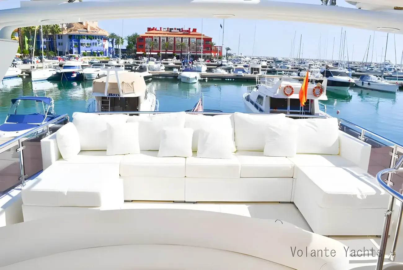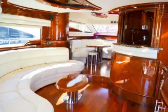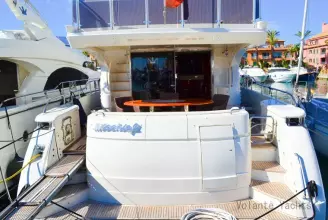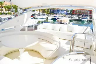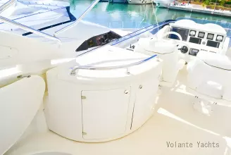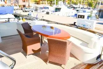 This particular Dominator 68S has undergone extensive upgrades recently, specifically the flybridge has added contemporary style stainless steel railings and a spacious and comfortable rear lounge seating area, which enhances the whole design of the boat and adds an additional leisure area.